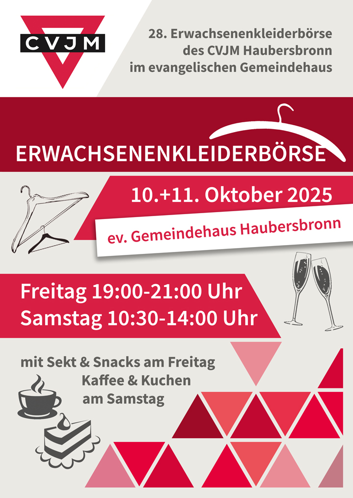 unsere diesjährige Erwachsenenkleiderbörse des CVJM-Haubersbronn findet am 10. und 11.10.2025 im ev. Gemeindehaus Haubersbronn statt. Angeboten werden gut erhaltene Kleidung, Schuhe und Accessoires für Damen und Herren. Die Verkaufszeiten sind am Freitag von 19.00 Uhr bis 21.00 Uhr mit Sekt & Snacks und am Samstag von 10.30 Uhr bis 14.00 Uhr mit Kaffee & Kuchen und herzhaften Kleinigkeiten.
